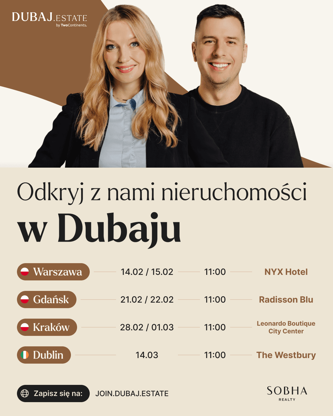 Spotkania poprowadzą: Hubert Pleskot (założyciel Dubaj.Estate by Two Continents) oraz Kasia Koleśnik - specjalistka ds. sprzedaży w naszym biurze. Na spotkaniu będzie obecny także przedstawiciel Sobha Realty - drugiego największego dewelopera w Zjednoczonych Emiratach Arabskich oraz Paulina Pospieszna (Gdańsk), Piotr Kopacz (Kraków) i Filip Denys (Warszawa).